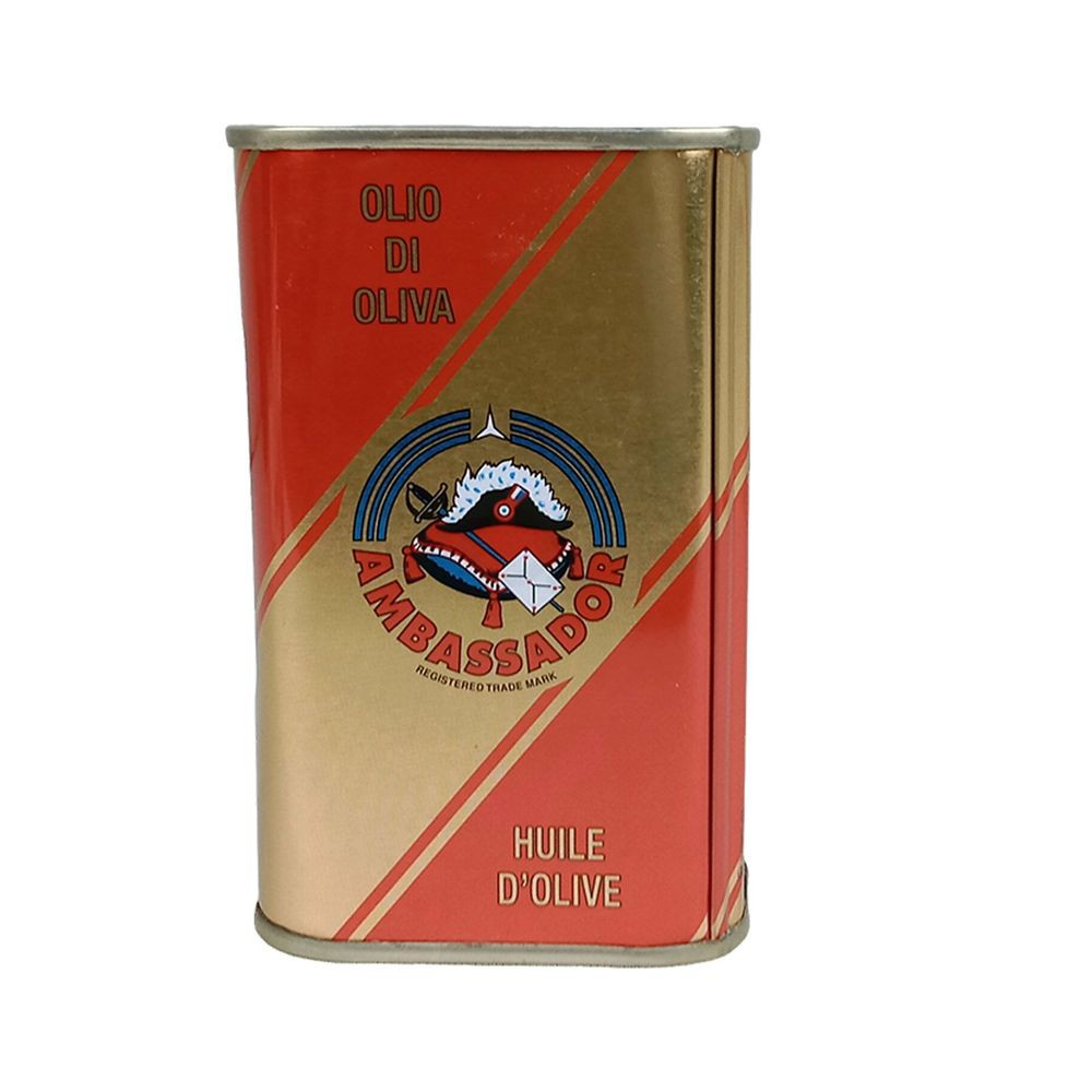 Ambassador Spanish Olive Oil in the 150ml can is a pure and natural olive oil sourced from Spain, intended for cosmetic use on skin and hair. It contains a blend of extra virgin and refined olive oil and is praised for its moisturizing and anti-aging properties.